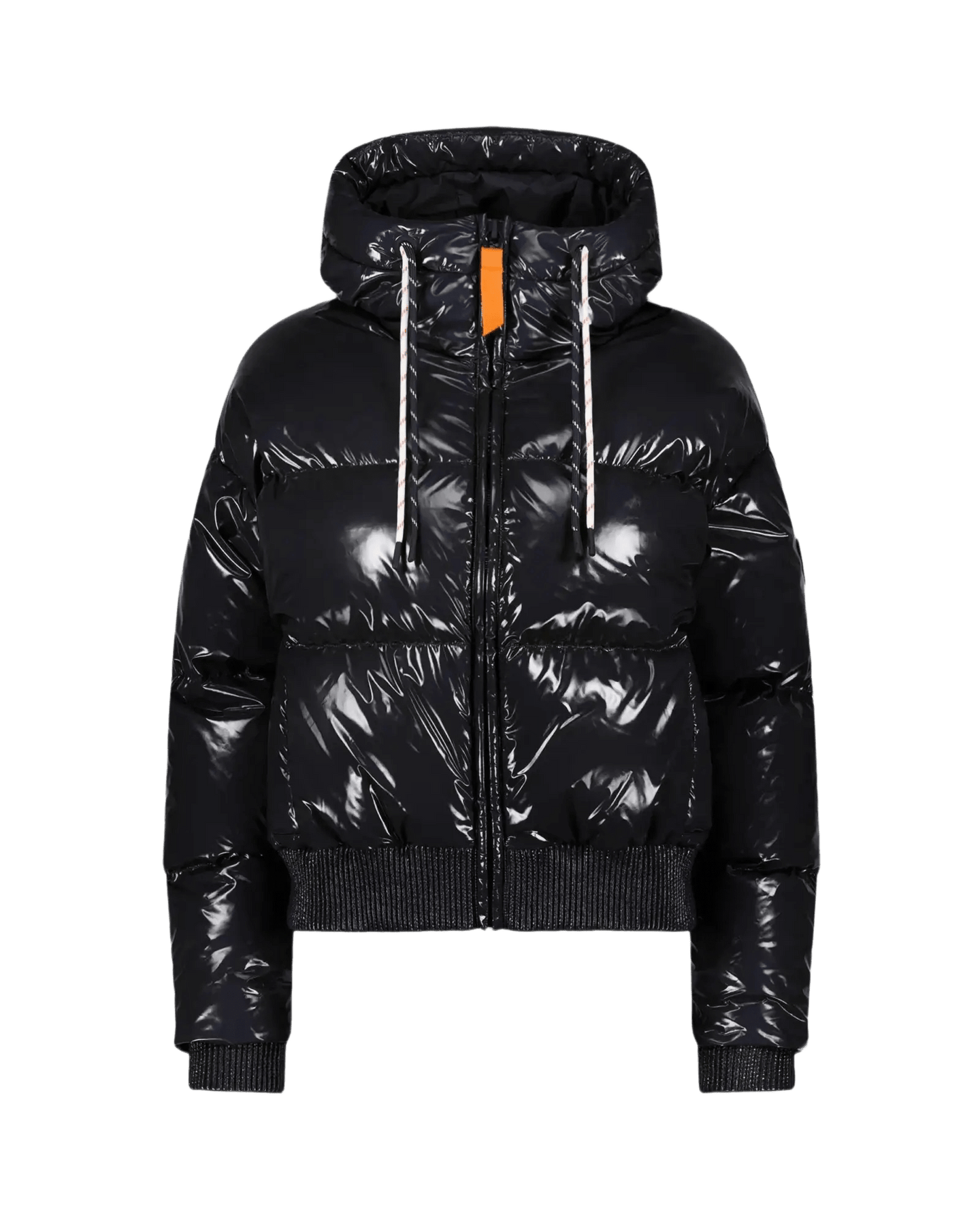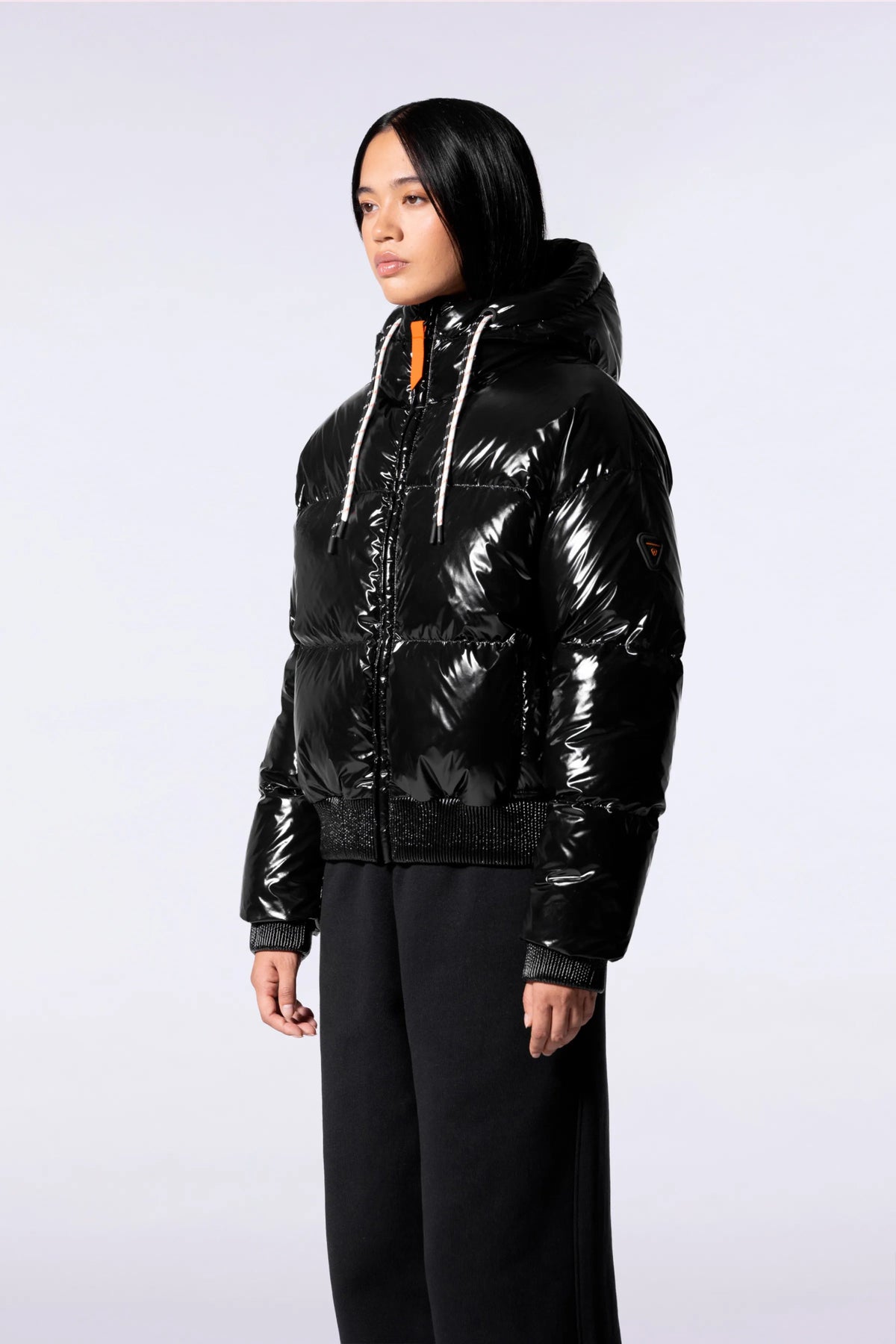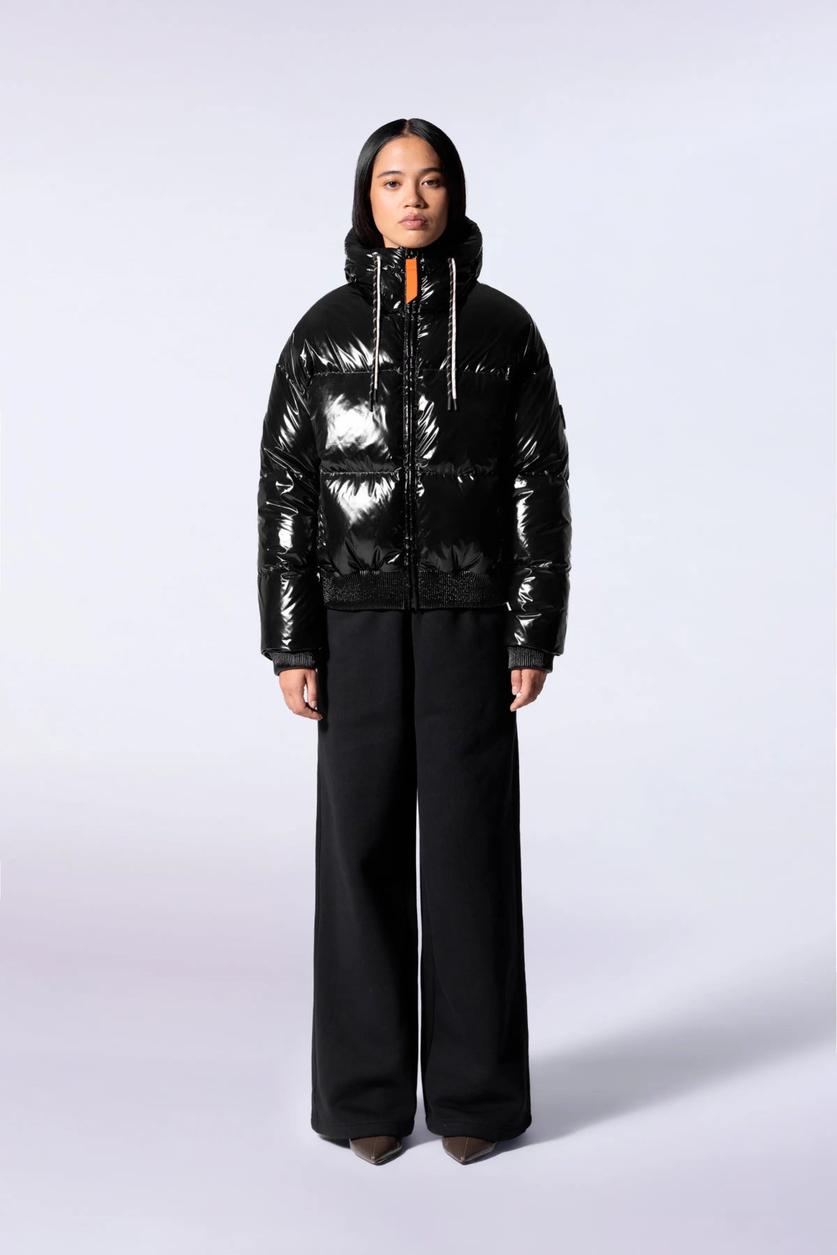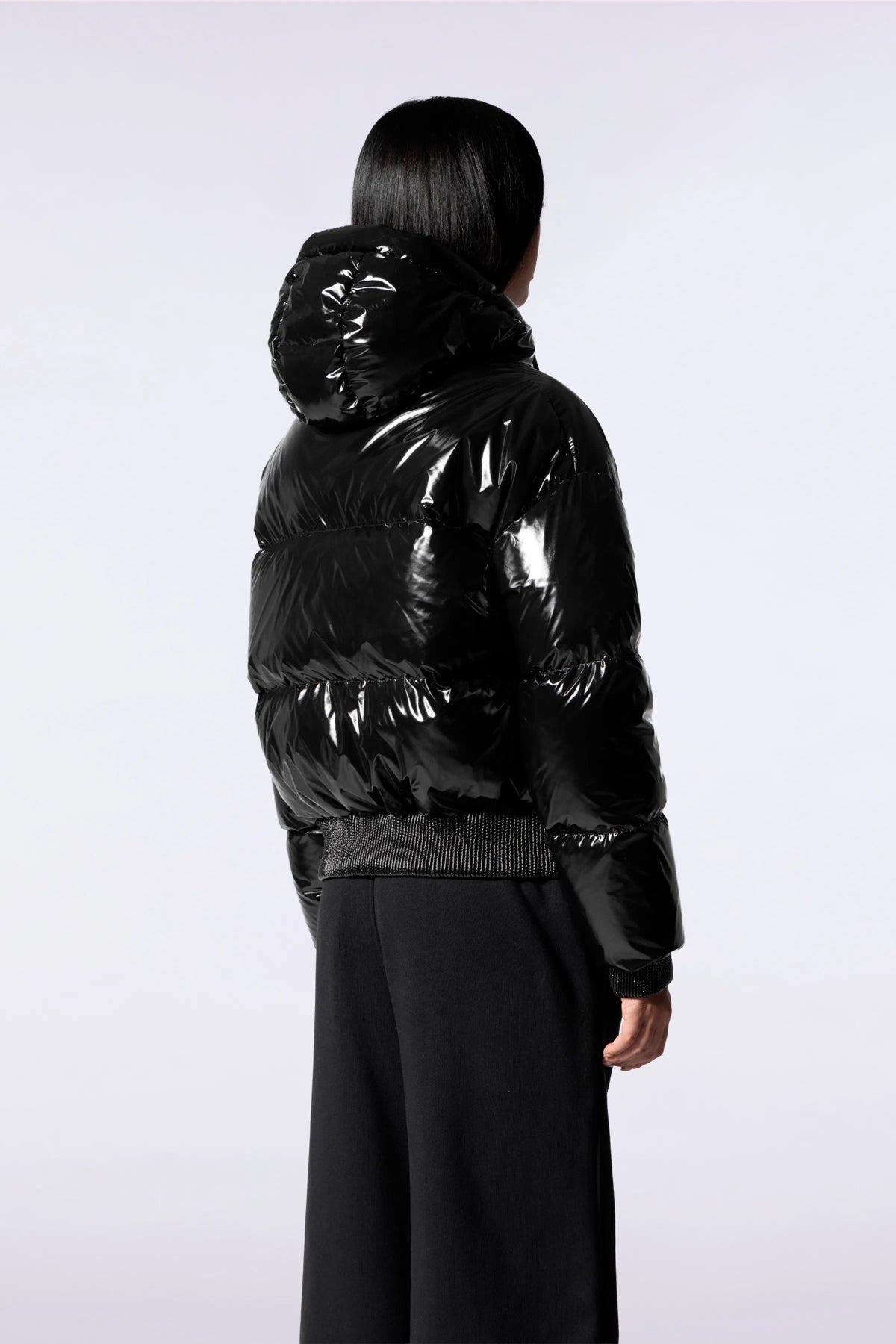 NINE est une doudoune courte à capuche confectionnée en matière brillante. Les manches tombantes et le bas de vêtement sont élastiqués. La capuche est ajustable grâce à un cordon technique. L’ouverture milieu devant se fait par un zip en plastique injecté rehaussé d’une tirette contrastée. Deux poches sont insérées sur le devant. Le patch en silicone ton sur ton iconique de la marque est apposé sur l’épaule.