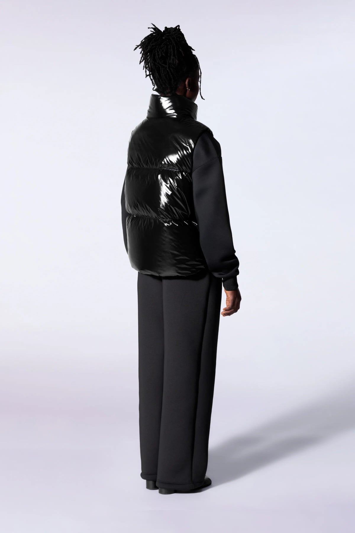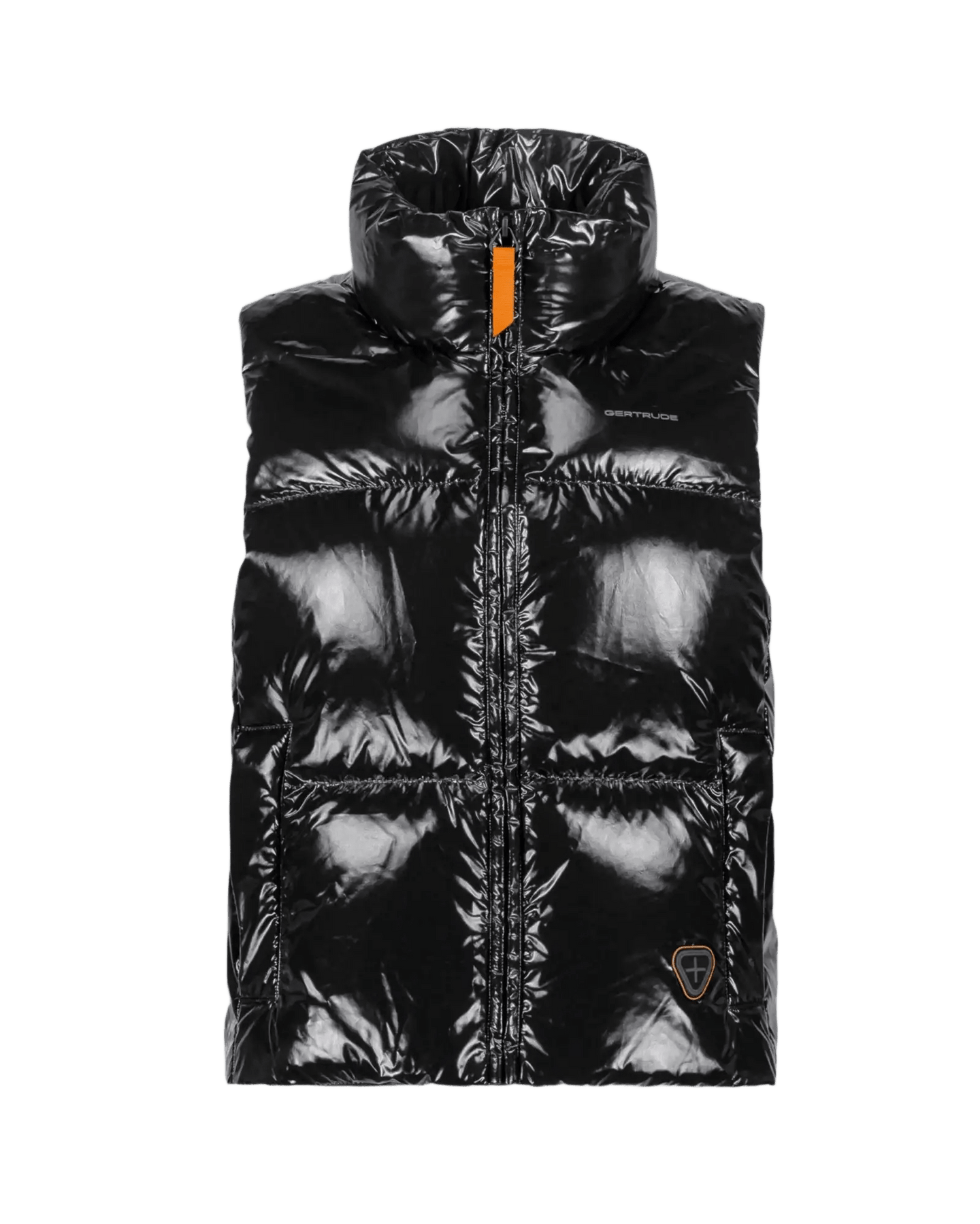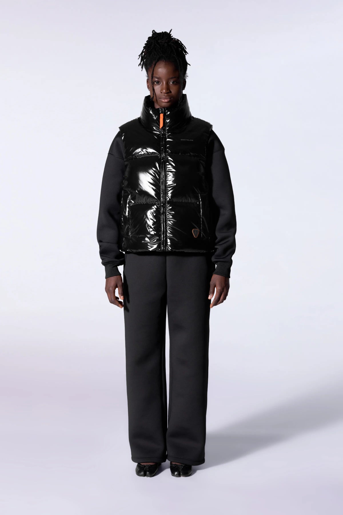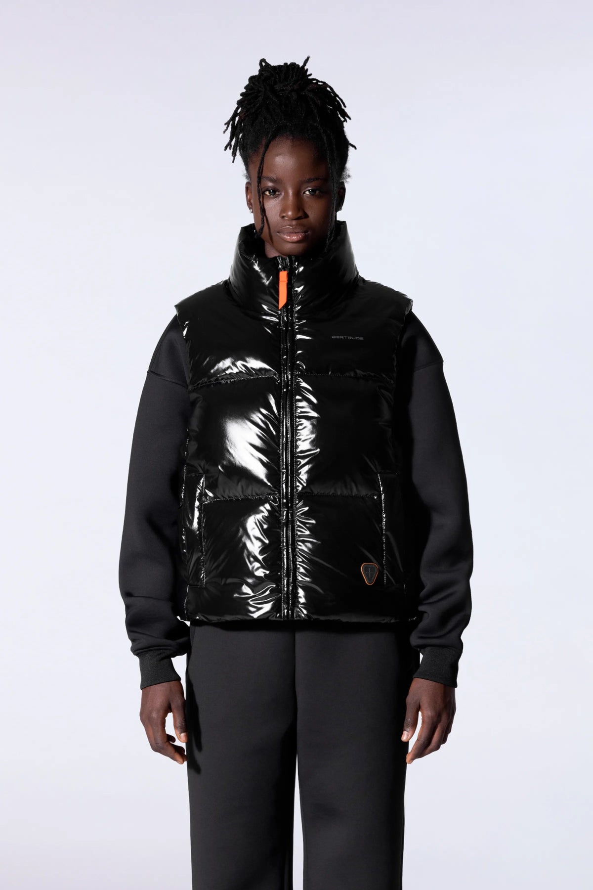 GALILEE est une doudoune sans manche à gros boudins, col montant, volume puffy confectionnée en matière brillante. Une capuche est cachée dans le col. L’ouverture milieu devant se fait par un zip en plastique injecté doté d’une tirette contrastée. Deux poches latérales sont insérées dans la découpe devant. Le logo de la marque est imprimé sur la poitrine. Le patch en silicone iconique ton sur ton est cousu sur le bas devant.
