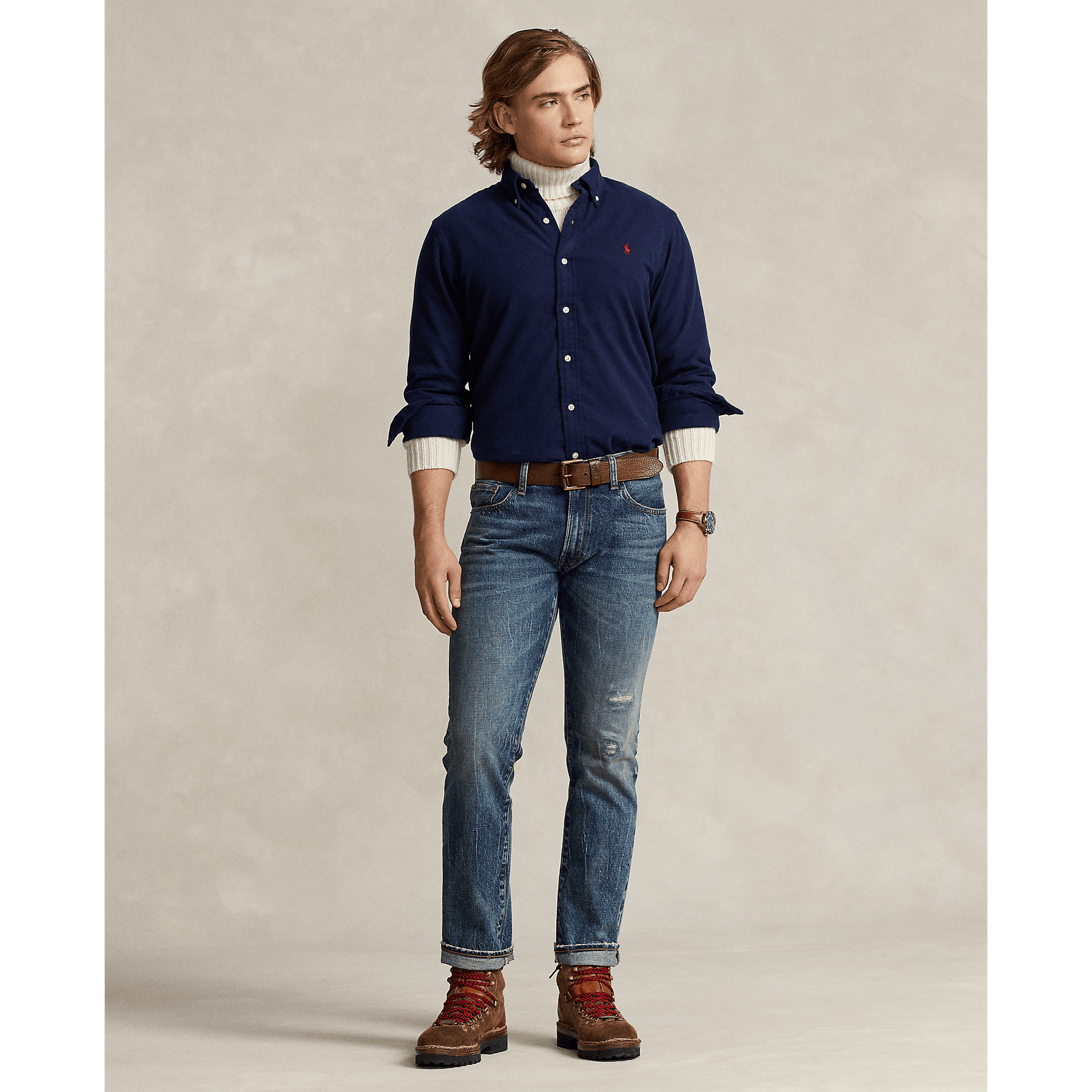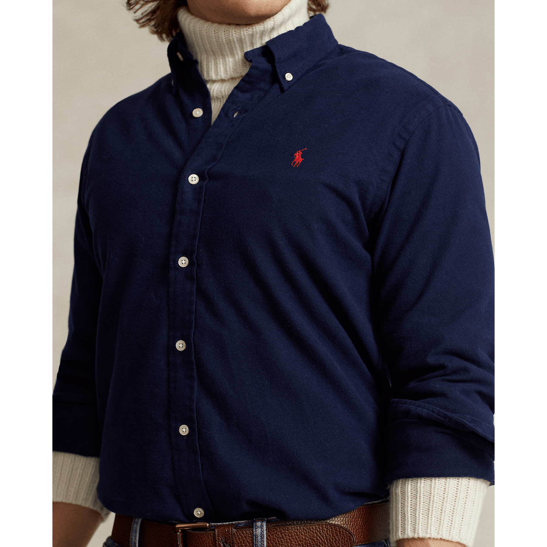 Cette chemise ajustée est confectionnée en flanelle de coton brossée et ornée de notre poney brodé emblématique.