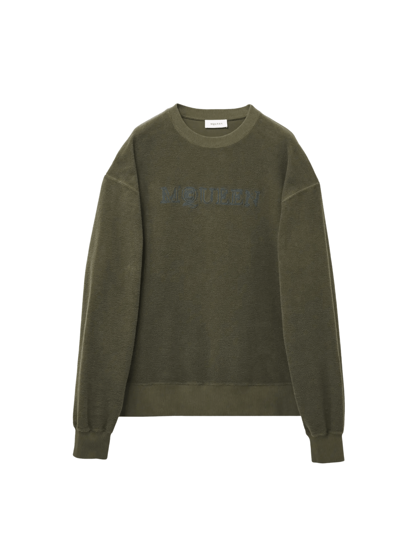 Sweat-shirt à col rond en coton délavé vert, orné d'un logo McQueen brodé sur le devant. Ce modèle est rehaussé de détails côtelés ton sur ton.