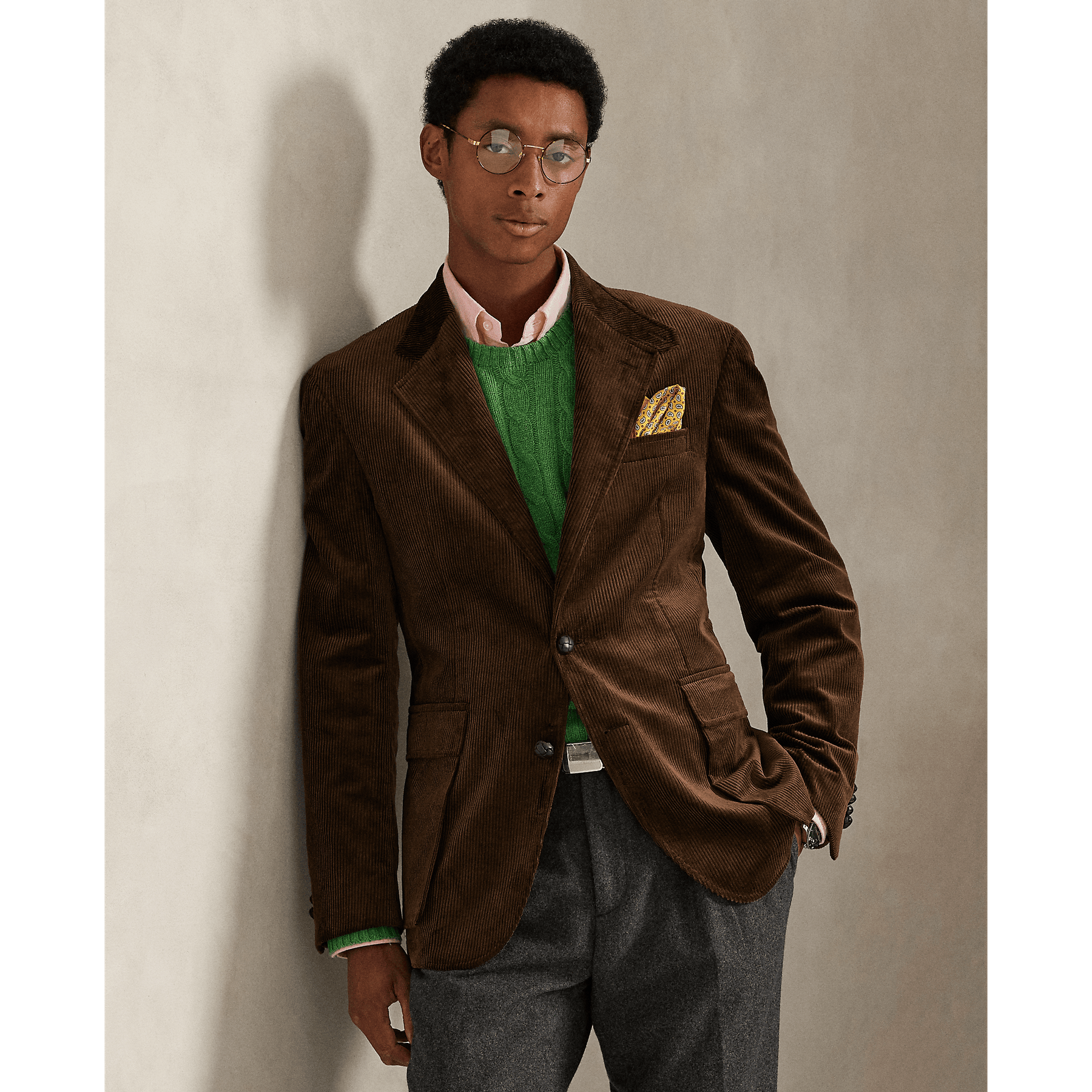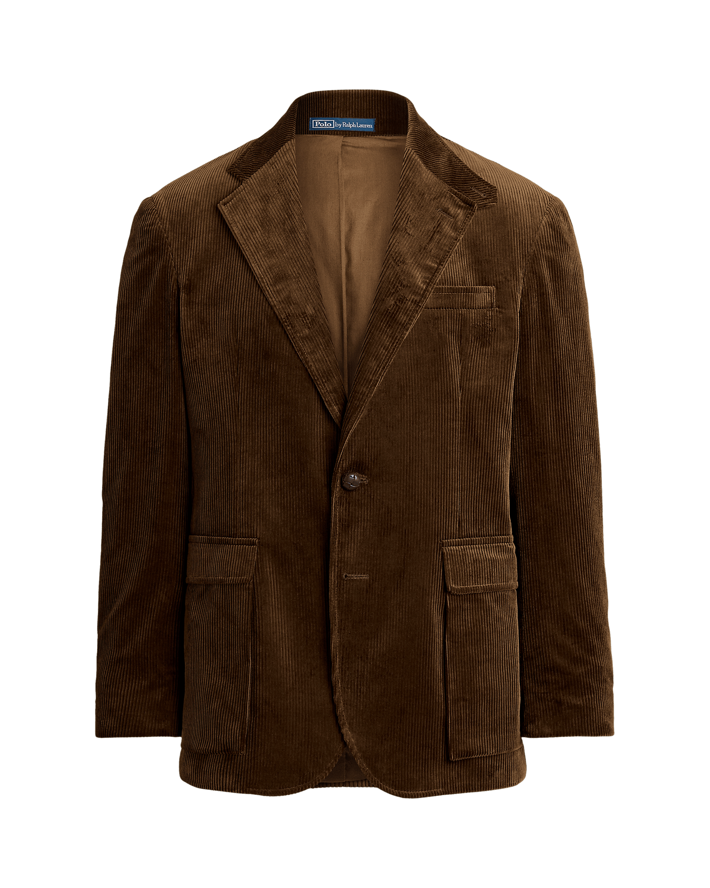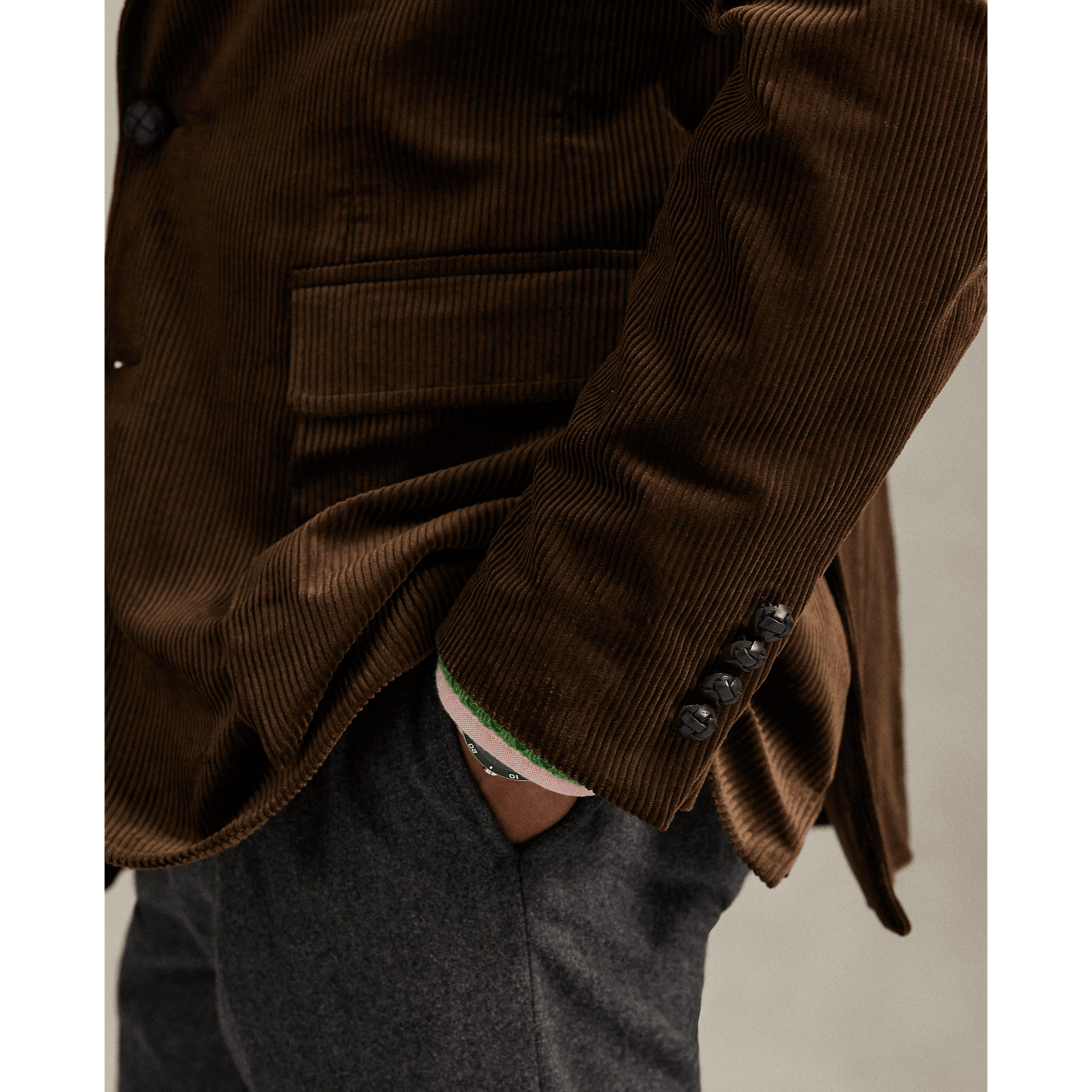 Créée à l'occasion du cinquantenaire de Ralph Lauren, la veste RL67 est inspirée d'un blazer précieusement conservé dans le vestiaire de M. Lauren depuis 1971. Cette nouvelle version a été confectionnée en velours italien à larges côtes et rehaussée de boutons en cuir tressé.