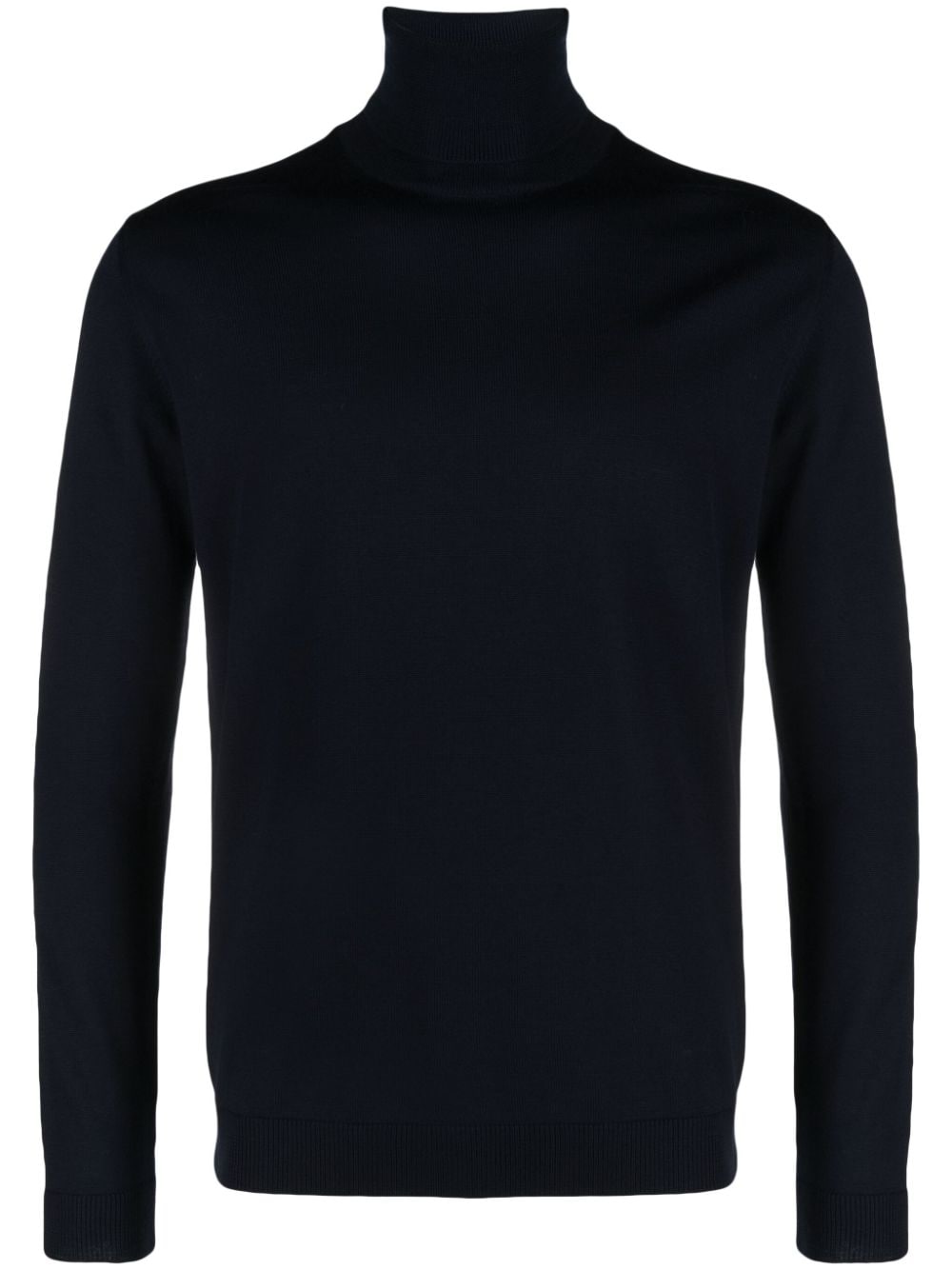 Marine, mérinos, design en maille, col roulé, manches longues, ourlet droit.
